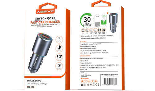 De Xssive XSS-CC37 is een krachtige autolader met een gecombineerd vermogen van maar liefst 53W. Dankzij de USB-C Power Delivery-poort en de USB-A Quick Charge 3.0-poort laad je twee apparaten razendsnel én tegelijkertijd op. Ideaal voor onderweg, zowel voor privégebruik als zakelijk.